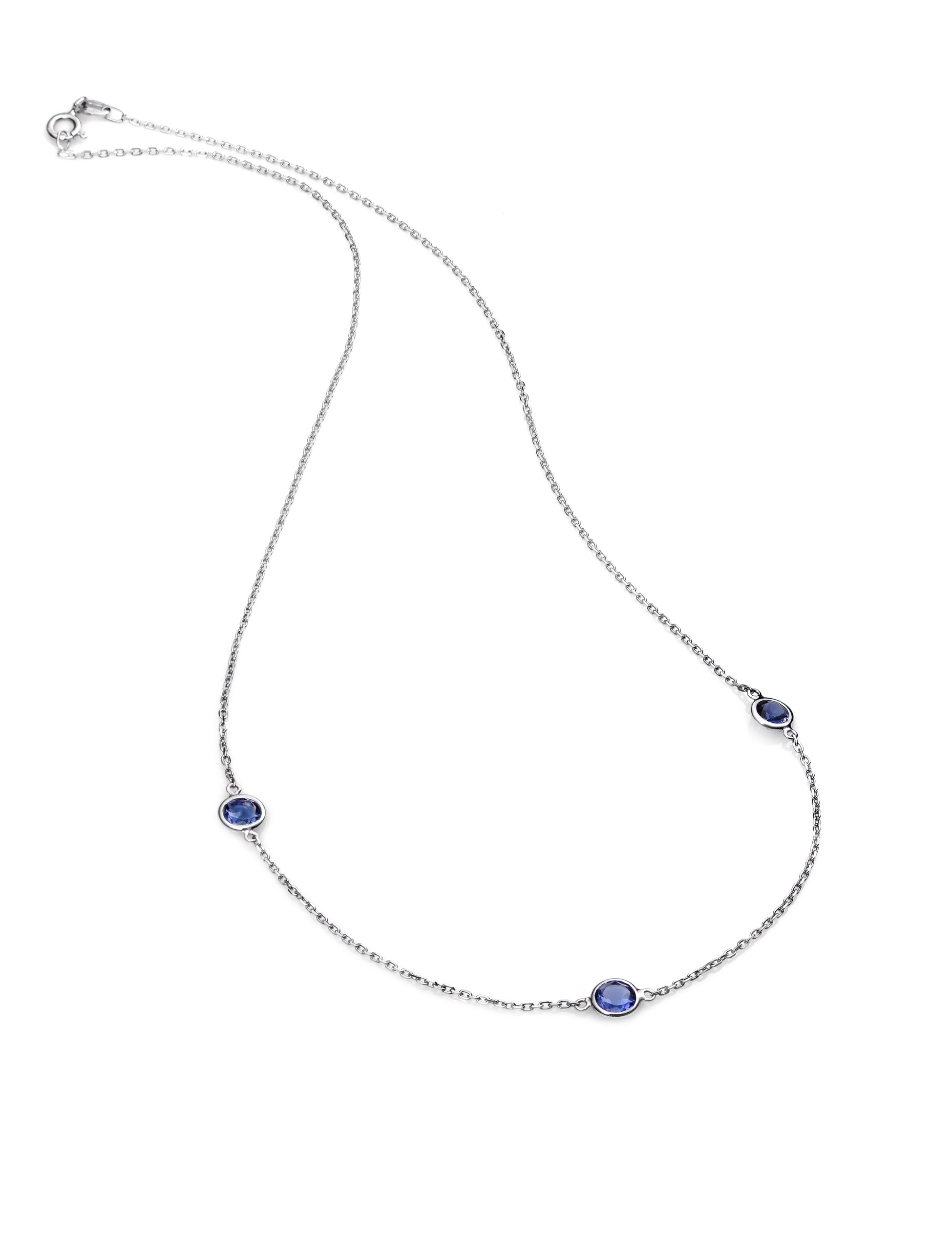 Colgante gargantilla oro blanco con tres iolitas azules, montadas en cadena de oro blanco 18kt(42cms)