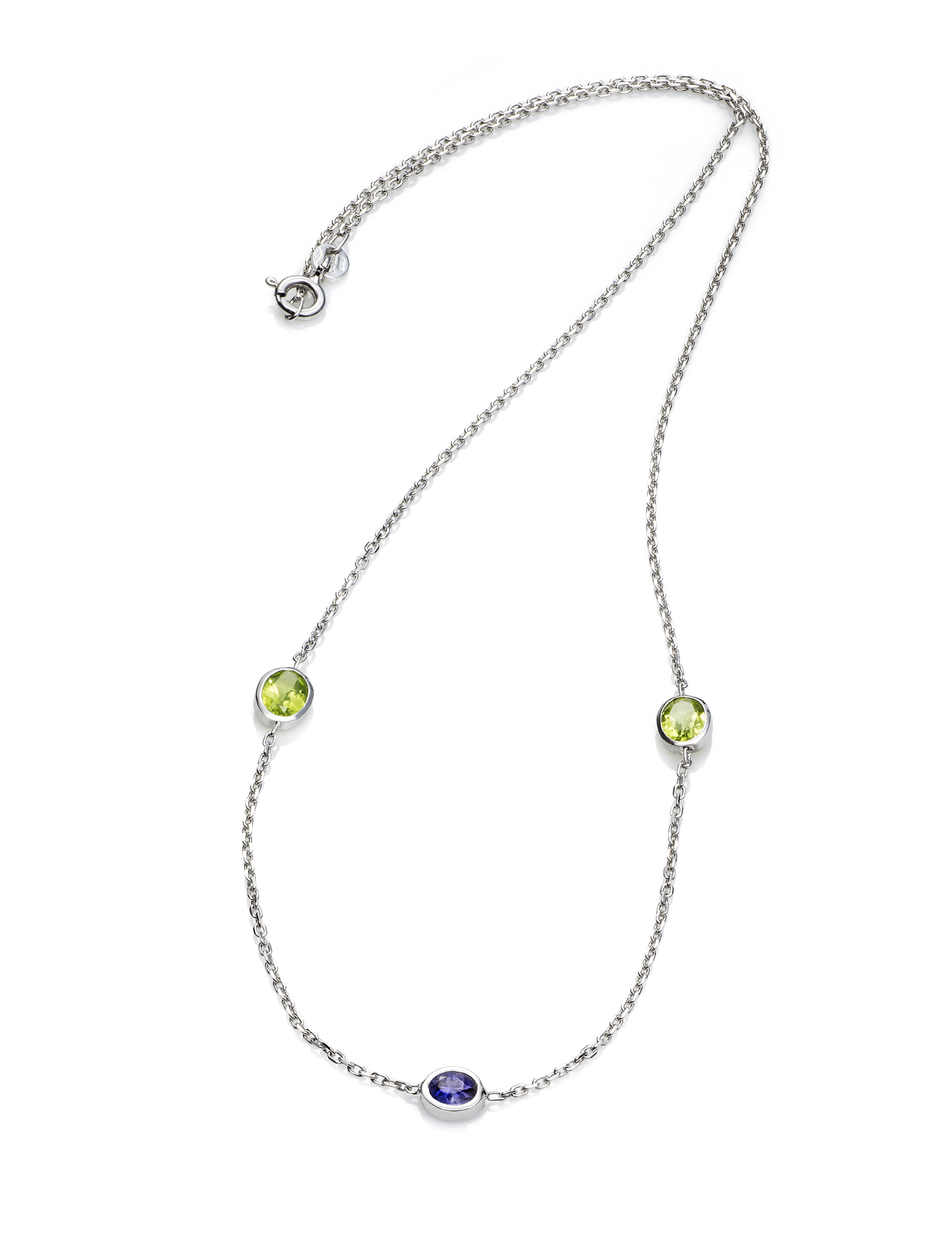 Colgante gargantilla oro blanco con dos peridotos y una iolita, montadas en cadena de oro blanco 18kt(42cms)
