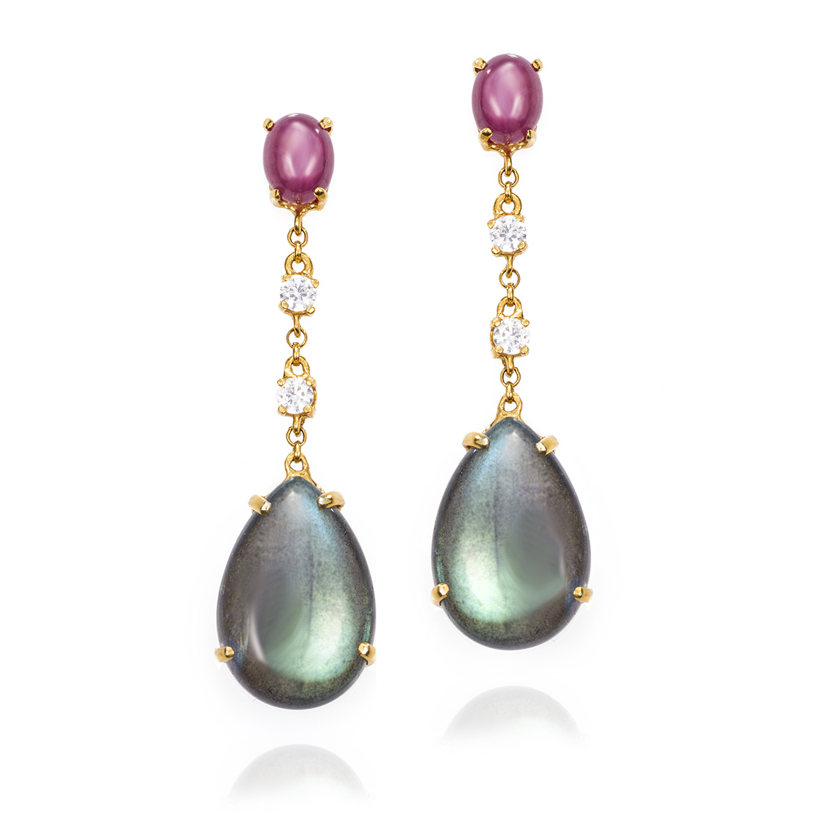 Plata de ley/dorada, rubíes cabujon, circonitas, labradoritas.